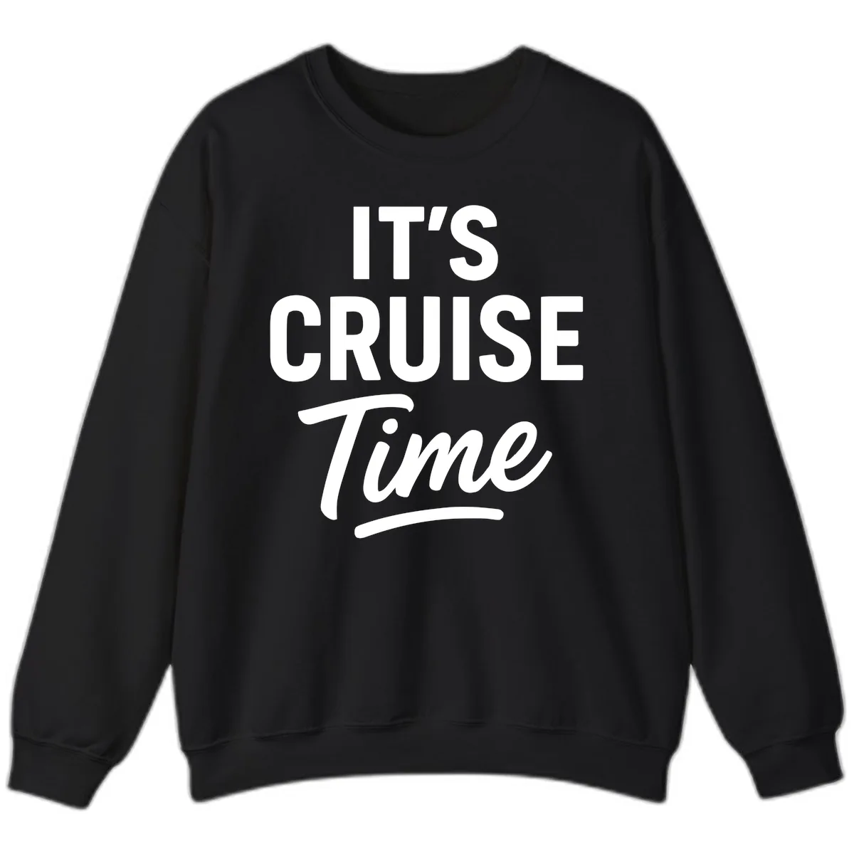 The bold, energetic 'IT'S CRUISE Time' typography stands out clearly on the sweatshirt material. The design captures the anticipation of departure in a cozy, wearable format.