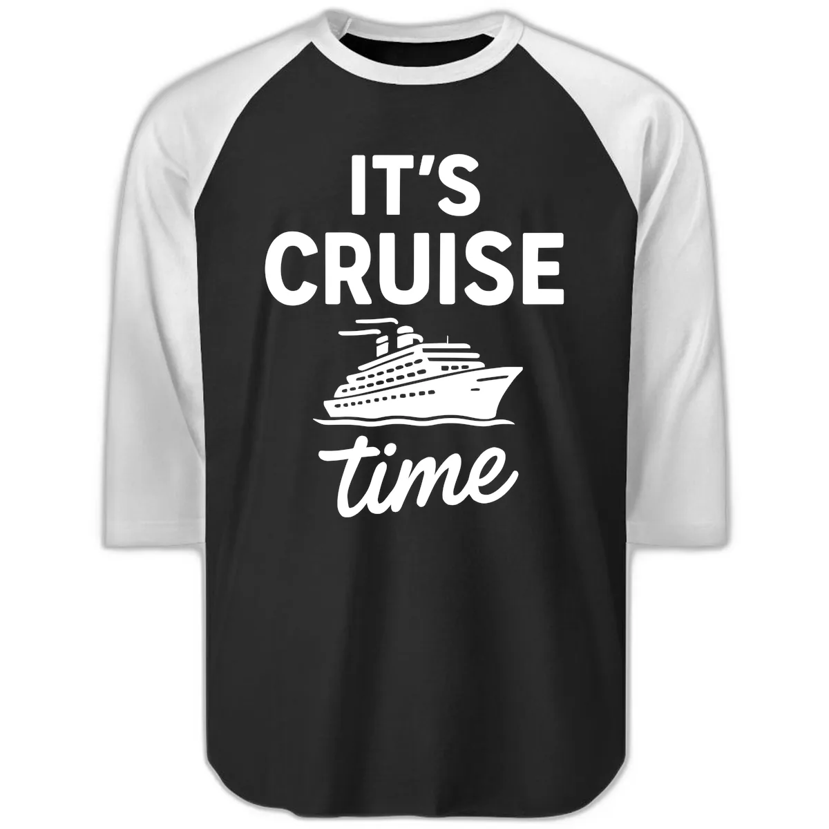 Hit the deck in style with the "It's Cruise Time" Raglan 3/4 Sleeve Tee! This baseball-style shirt features the exciting "IT'S CRUISE time" declaration, complete with a sharp cruise ship graphic sailing on ocean waves. The contrasting sleeves add a classic touch, making it a perfect choice for kicking off your cruise vacation.