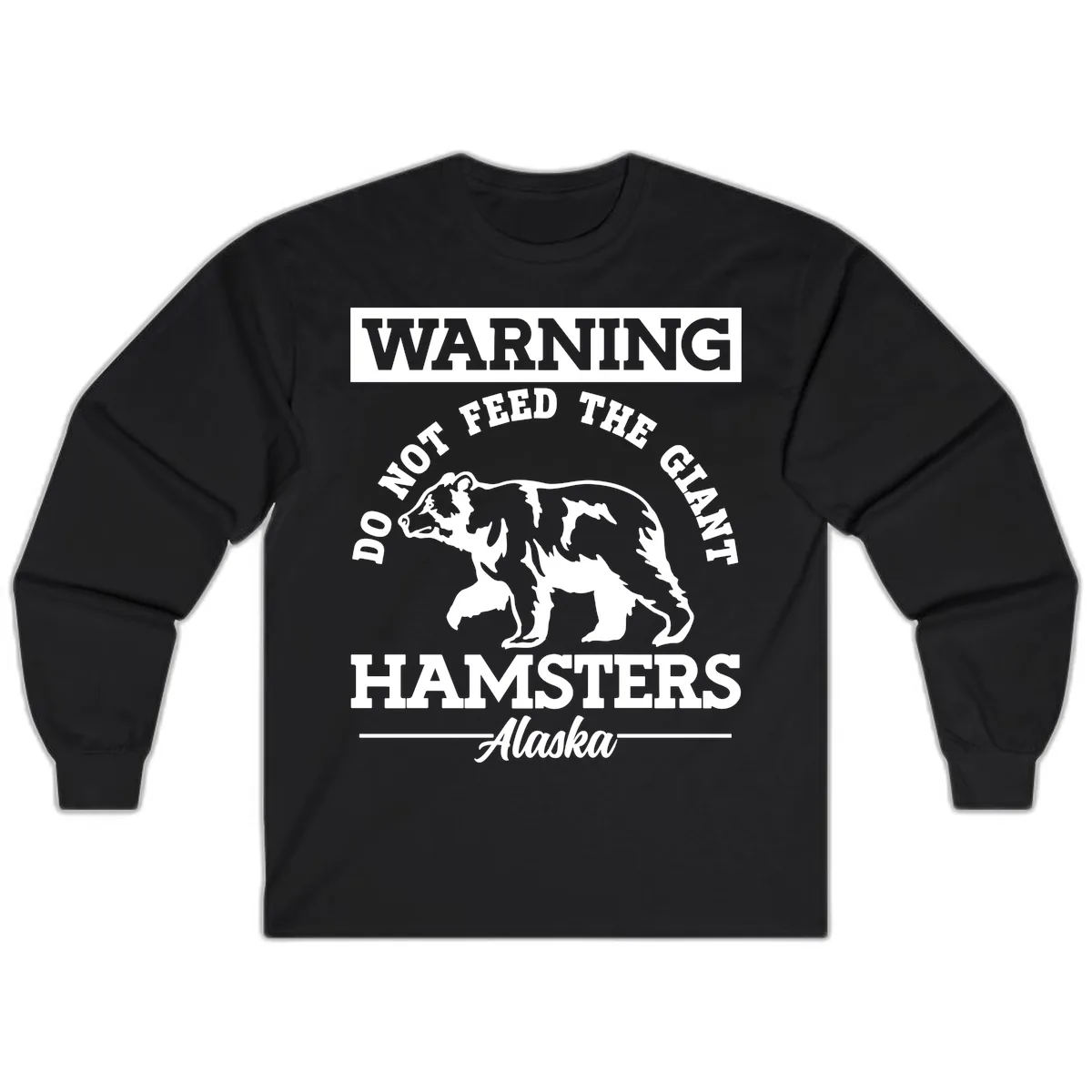 The humorous warning sign design, featuring the bear silhouette and 'WARNING DO NOT FEED THE GIANT HAMSTERS Alaska' text, is prominently displayed on the chest or back of the long sleeve tee. It provides a full-coverage graphic that's perfect for cooler Alaska days.