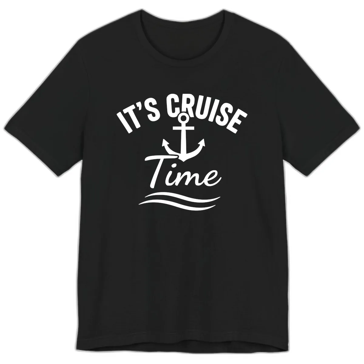 The 'IT'S CRUISE TIME' text and anchor graphic maintain their crisp, bold appearance on the premium material. The design's nautical theme complements the elevated feel of this tee.