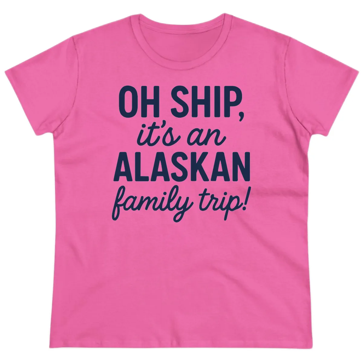 Yes, the bold typography of 'OH SHIP, it's an ALASKAN family trip!' is clearly displayed and looks fantastic on this ladies' tee, ensuring your cruise humor is front and center.