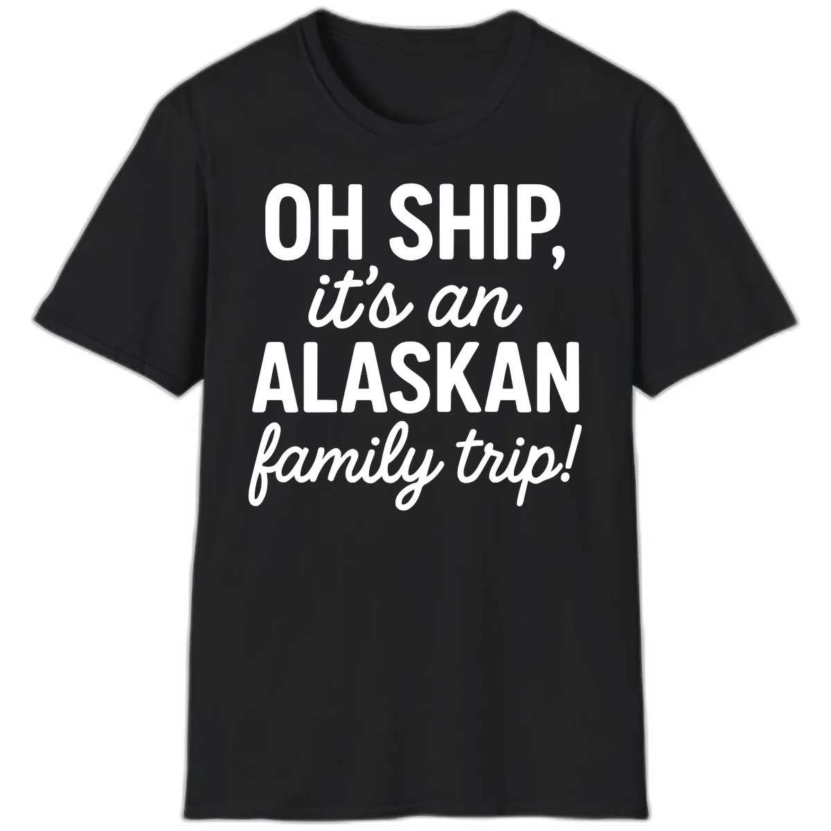This t-shirt features a playful text-based design with the bold pun 'OH SHIP' and the accompanying phrase 'it's an ALASKAN family trip!' in a mix of font styles and sizes, creating a fun and eye-catching look perfect for your cruise.