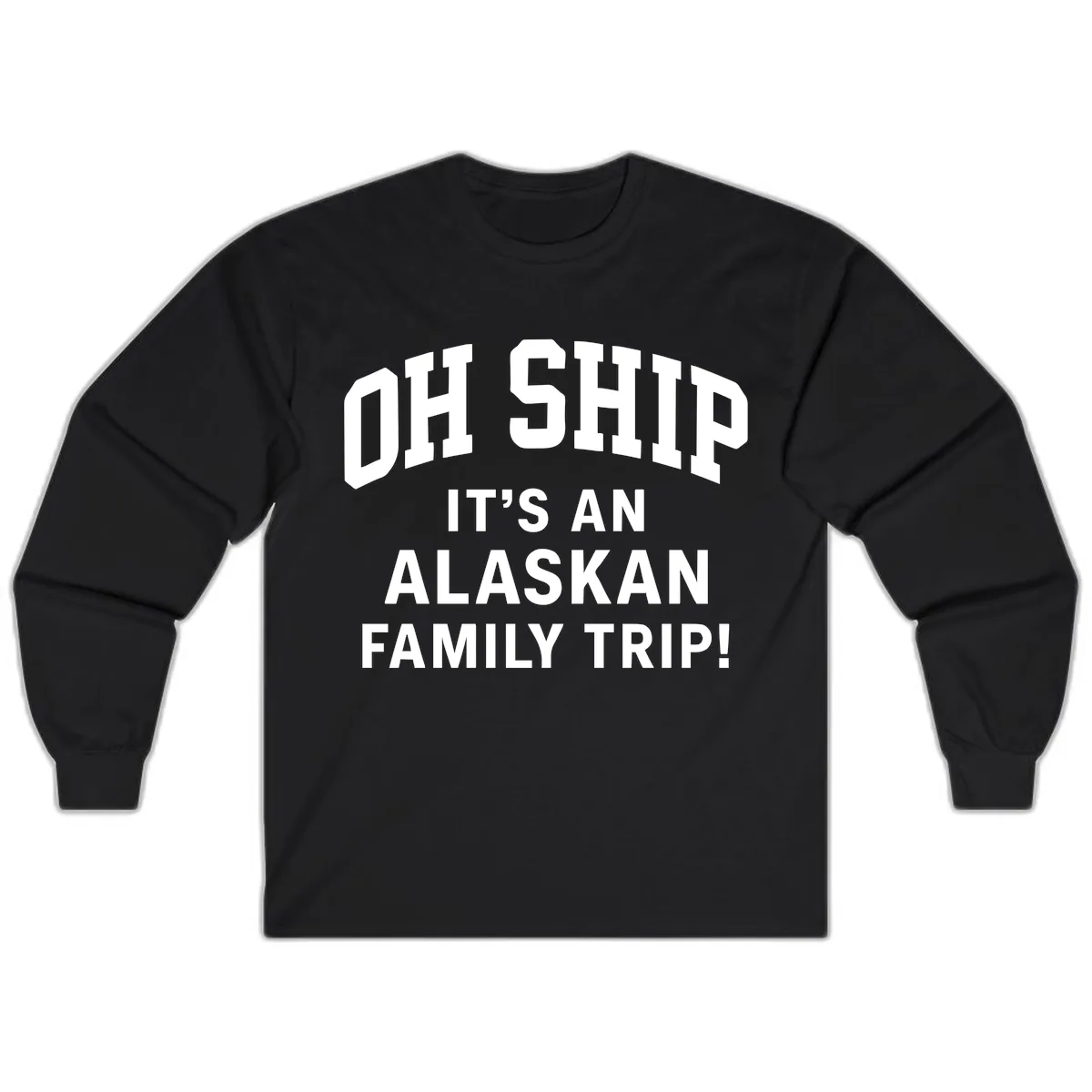 The bold 'OH SHIP' lettering with its 3D-style perspective and the accompanying text 'IT'S AN ALASKAN FAMILY TRIP!' are printed clearly on the long sleeve. The design's clean typography looks great on this style, perfect for your cruise.