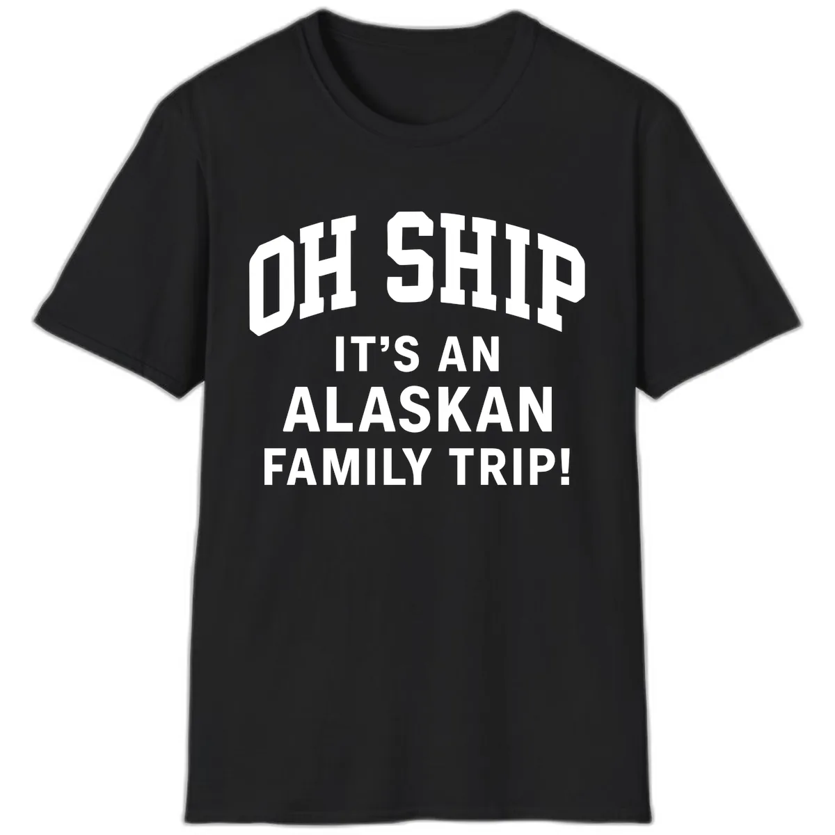 How does the 'OH SHIP' lettering appear on this Alaskan Family Trip shirt?