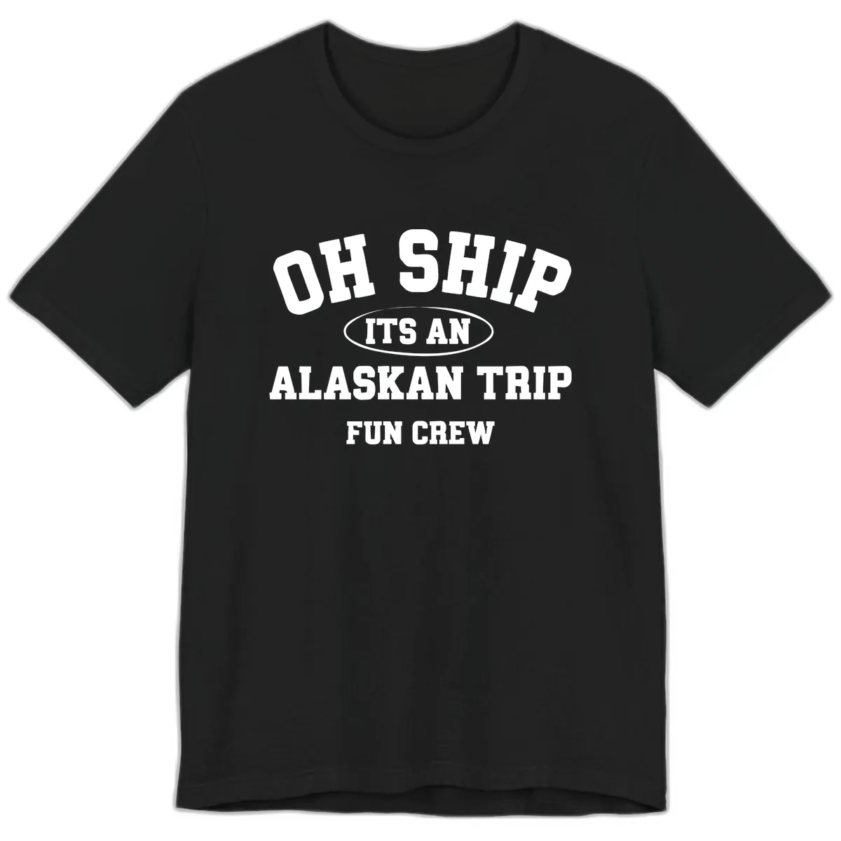 Elevate your Alaska cruise experience with the "Oh Ship It's An Alaskan Trip Fun Crew" Premium T-Shirt. This isn't just any tee; it's a statement piece designed for maximum laughs and maximum comfort. The standout "Oh Ship" pun, rendered in eye-catching bold block lettering within an oval badge frame, ensures your group's fun spirit is on full display from the moment you board.