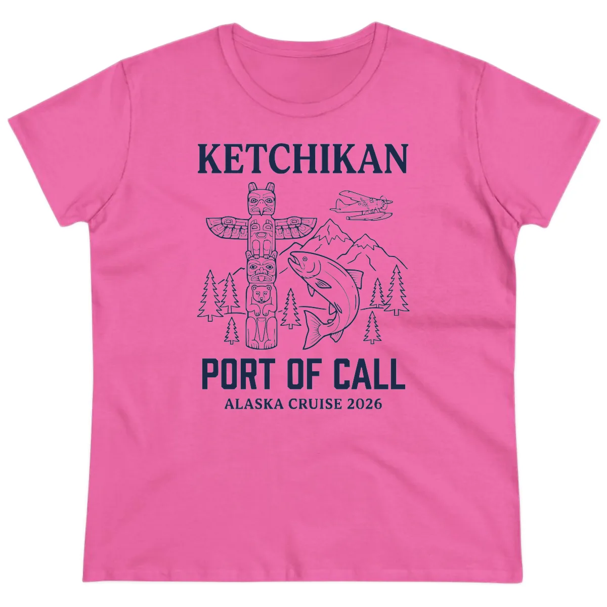Ladies, get ready to make a splash in Ketchikan with this stylish and comfortable Ladies Tee! Designed specifically for your 2026 Alaska cruise, it features a captivating monochromatic design that celebrates the unique beauty of this port. From the intricate totem pole and leaping salmon to the classic seaplane and majestic mountains, this tee is a wearable work of art that captures the essence of Southeast Alaska.