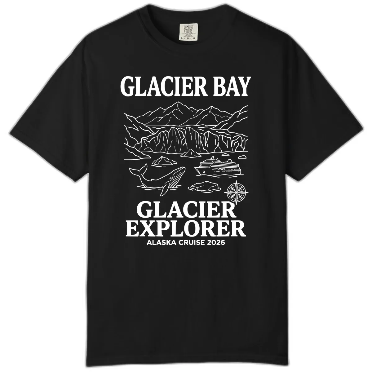Yes, the detailed line-art design featuring Glacier Bay, whales, mountains, and cruise elements, along with the 'GLACIER EXPLORER ALASKA CRUISE 2026' text, is printed to last on the durable Comfort Colors fabric.