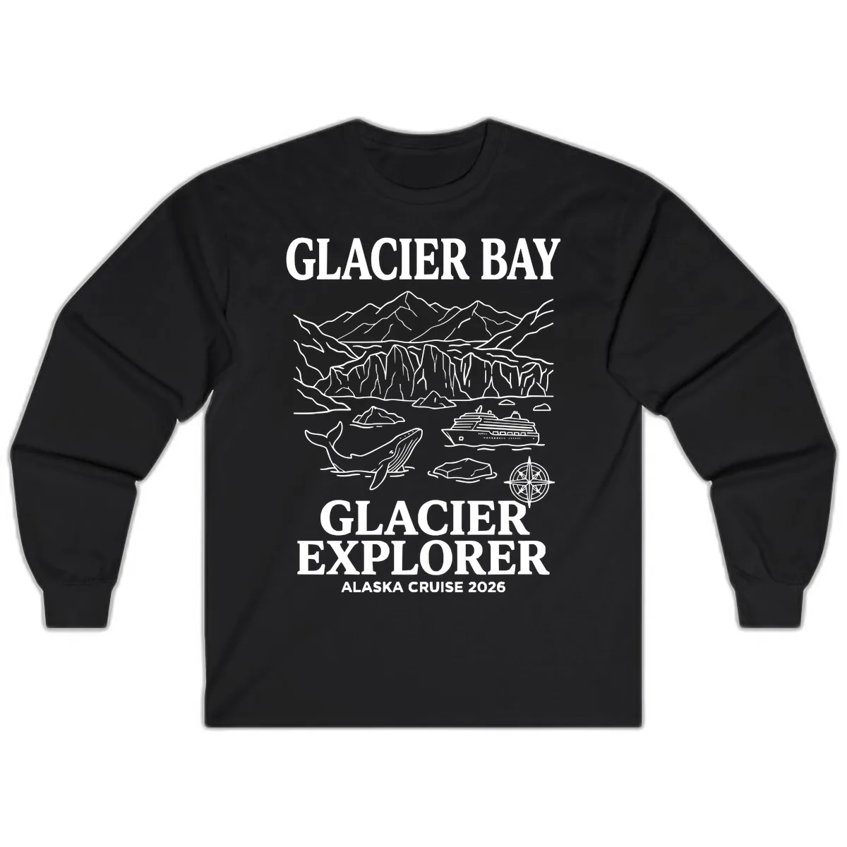 Embrace the cool Alaskan air with this Glacier Bay Explorer long sleeve shirt! Designed for your 2026 Alaska cruise adventure, this tee features a stunning scenic illustration of Glacier Bay National Park. From majestic glaciers and breaching whales to snow-capped mountains, this design captures the essence of your journey. Perfect for layering or wearing on its own, it’s a stylish way to remember your epic voyage.