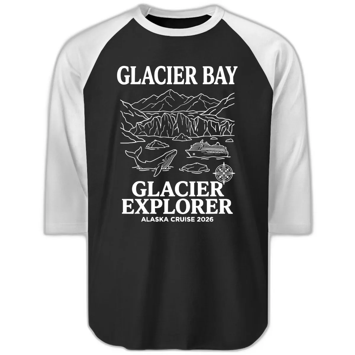 Yes, the detailed line-art illustration of Glacier Bay National Park, including glaciers, mountains, whales, and the compass rose, is beautifully displayed on this raglan tee. The 'GLACIER BAY', 'GLACIER EXPLORER', and 'ALASKA CRUISE 2026' text is also clearly integrated into the design.