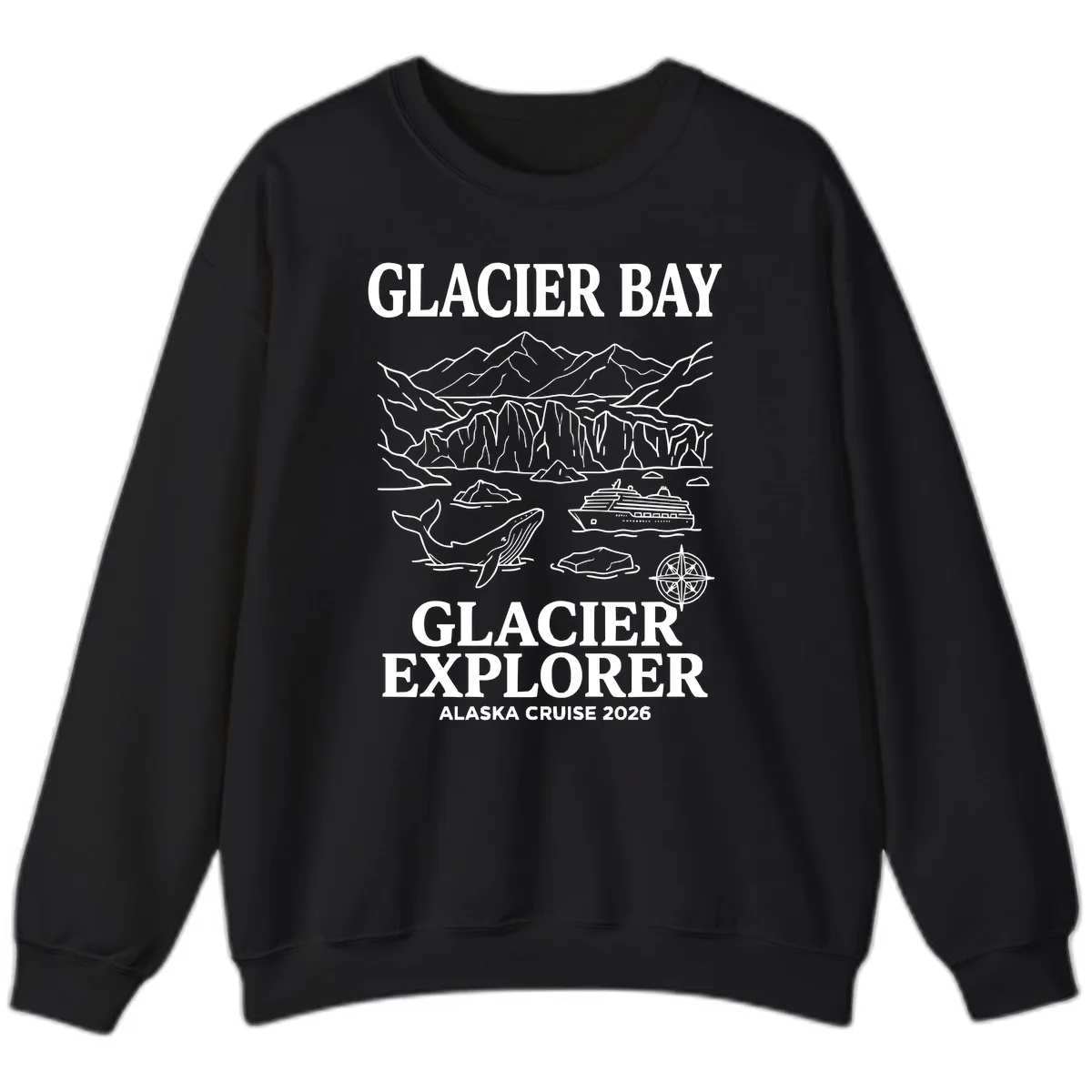 Brrr-ing on the adventure! Stay warm and stylish on your 2026 Alaska cruise with this Glacier Bay Explorer sweatshirt. Featuring a stunning line-art illustration of Glacier Bay National Park – complete with majestic glaciers, breaching whales, and dramatic mountains – this cozy sweatshirt is your perfect companion for chilly Alaskan evenings or onshore explorations. It’s the ultimate way to capture the memory of your incredible journey!