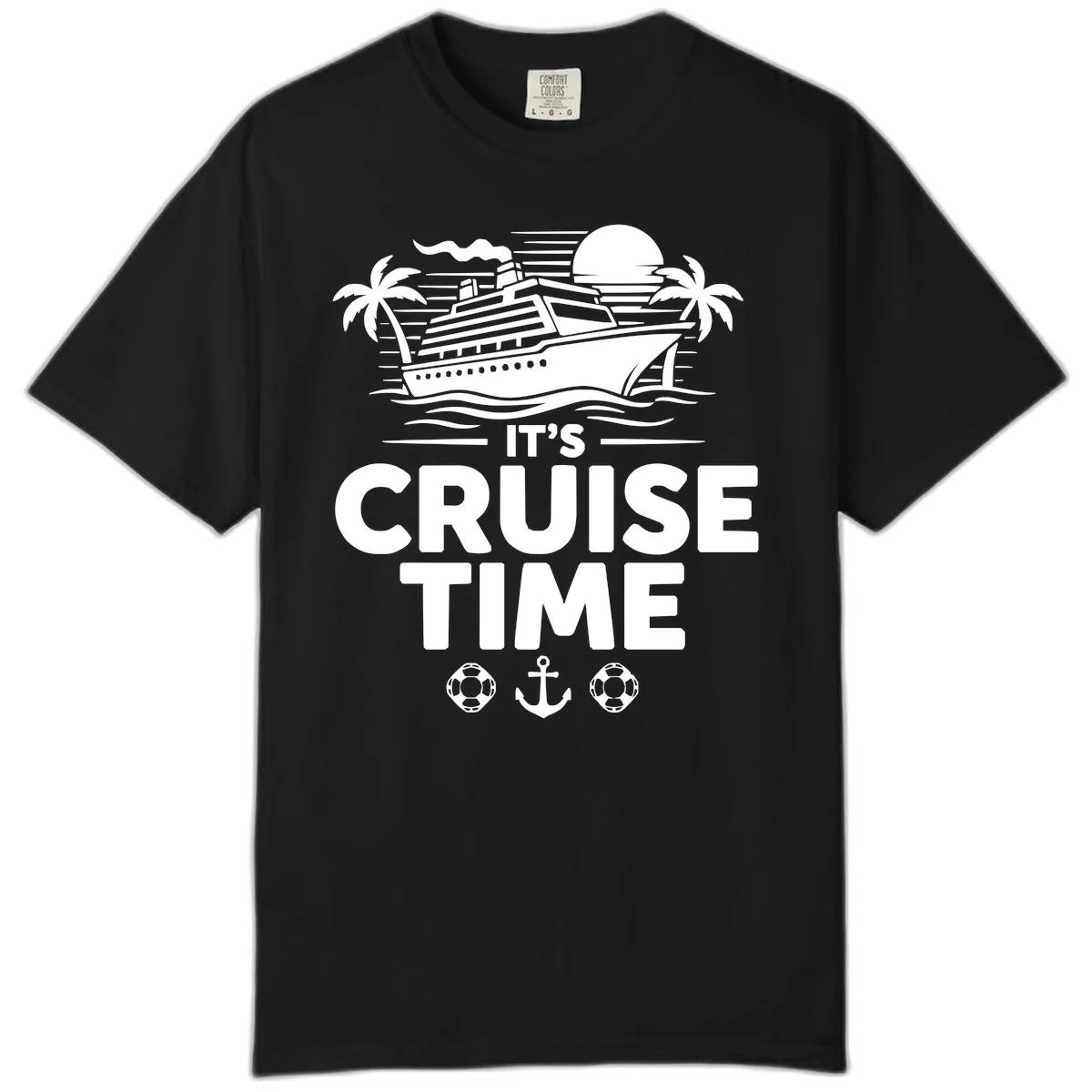 The vibrant 'It's Cruise Time Tropical Getaway' design, including the cruise ship and text, is printed on the garment-dyed fabric, providing a distinct look.