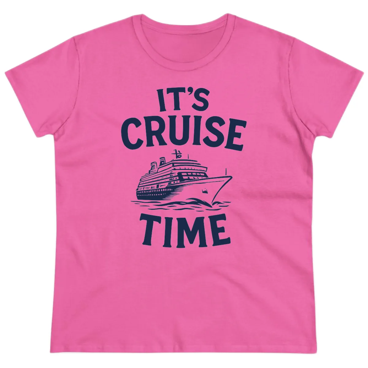 The bold 'IT'S CRUISE TIME' text and the detailed cruise ship illustration are prominently displayed, maintaining their impact on the ladies' fit for a stylish look.