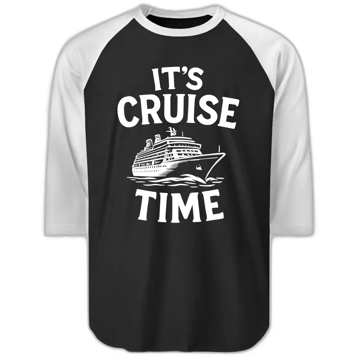 The bold 'IT'S CRUISE TIME' text and the detailed cruise ship illustration are printed clearly on the body of the raglan, making the design pop against the contrasting sleeves.