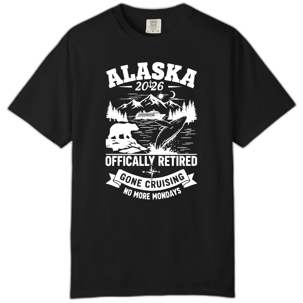 Kick back and relax in true retirement fashion with the "Alaska 2026 Officially Retired Gone Cruising" Comfort Color tee! This shirt is your personal announcement to the world that Mondays are officially cancelled. The design features a breathtaking, monochromatic scene of Alaska, complete with towering mountains, a majestic cruise ship, a breaching whale, and a foraging bear, all set against a backdrop of evergreen forests and starry skies. It's the ultimate blend of scenic beauty and retirement humor.