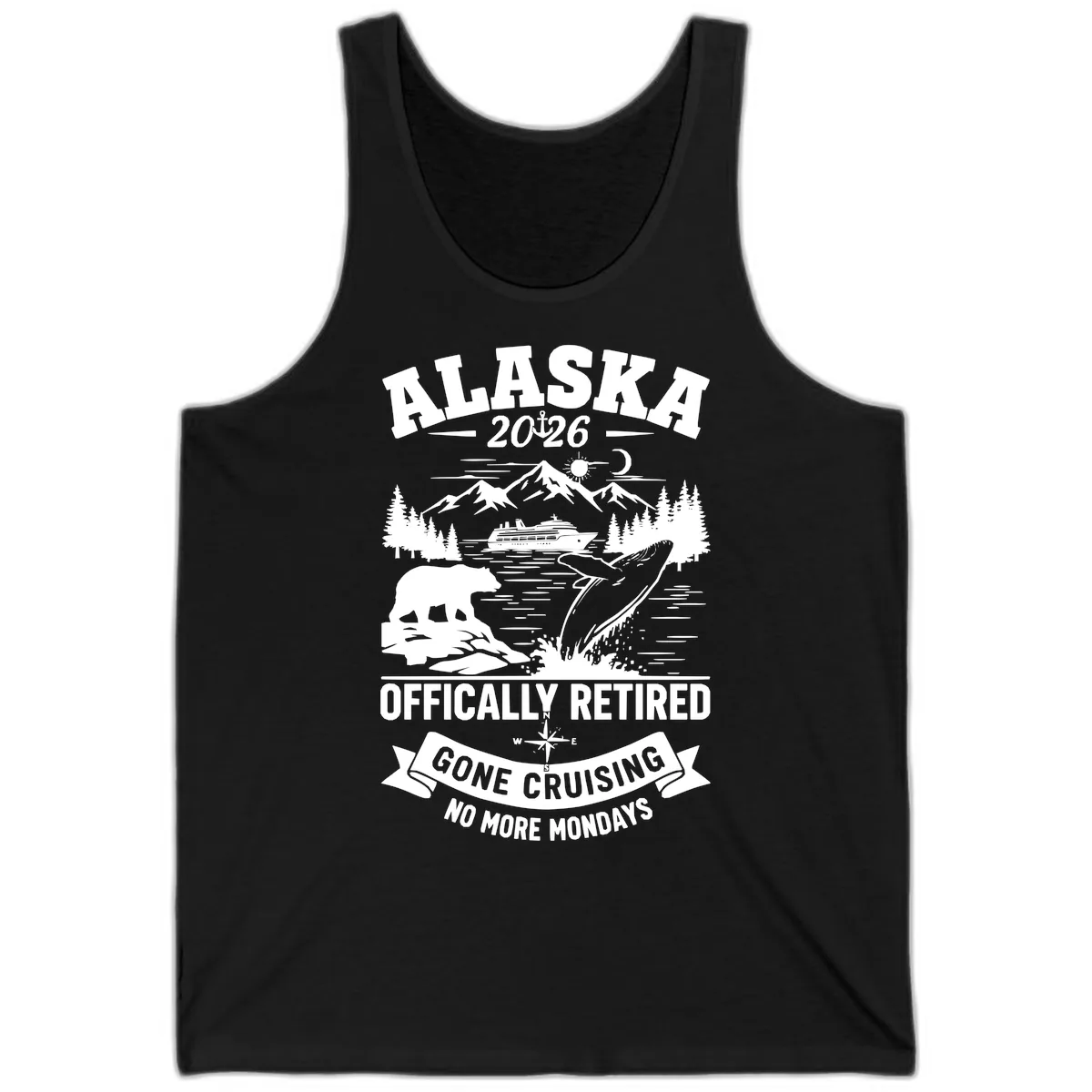 The 'Alaska 2026 Officially Retired Gone Cruising No More Mondays' message on a casual tank top is a lighthearted and fun way to share your retirement status and upcoming cruise plans.