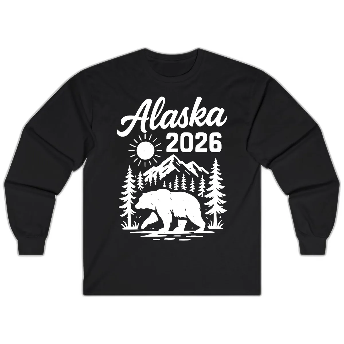 The detailed scenic design, featuring the polar bear and majestic mountains, is printed clearly on the long sleeves. The "Alaska 2026" text is positioned prominently to highlight your specific cruise year.