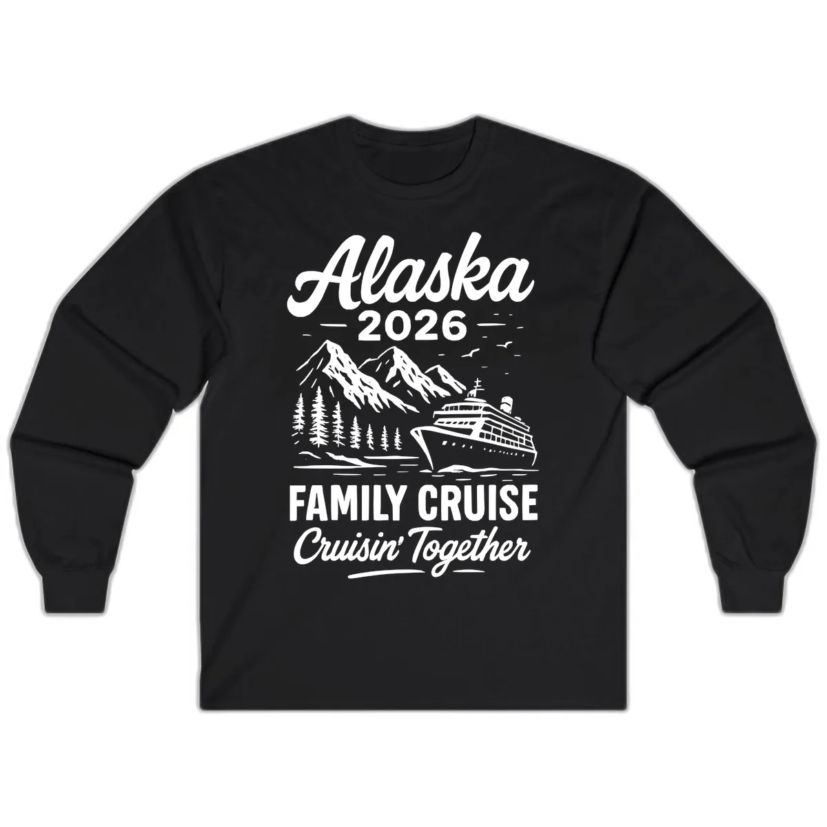The long sleeve features the same beautiful monochromatic scenic illustration of a cruise ship, mountains, and forests, along with the text 'Alaska 2026 FAMILY CRUISE Cruisin' Together'.