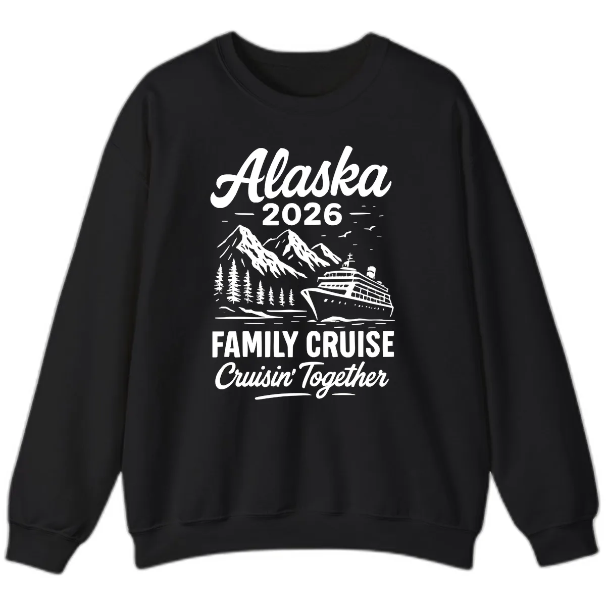 The sweatshirt features the full monochromatic scenic illustration of a cruise ship, mountains, and forests, with the bold text 'Alaska 2026 FAMILY CRUISE Cruisin' Together' completing the design.