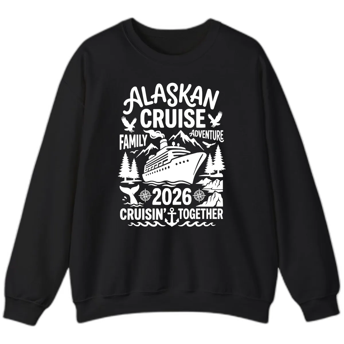 The detailed illustration, including the cruise ship, Alaskan scenery, and the 'ALASKAN CRUISE FAMILY ADVENTURE 2026 CRUISIN' TOGETHER' text, is printed clearly and vibrantly on the sweatshirt, making it a standout piece.