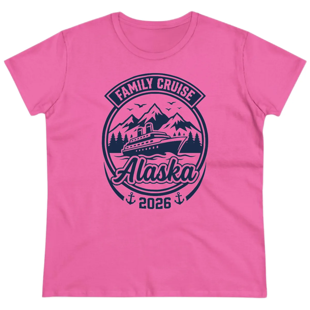 The vintage-style badge, with its cruise ship, mountains, and 'FAMILY CRUISE Alaska 2026' text, is printed to perfectly complement the ladies' cut. The design elements are clear and vibrant, enhancing the shirt's overall appeal.