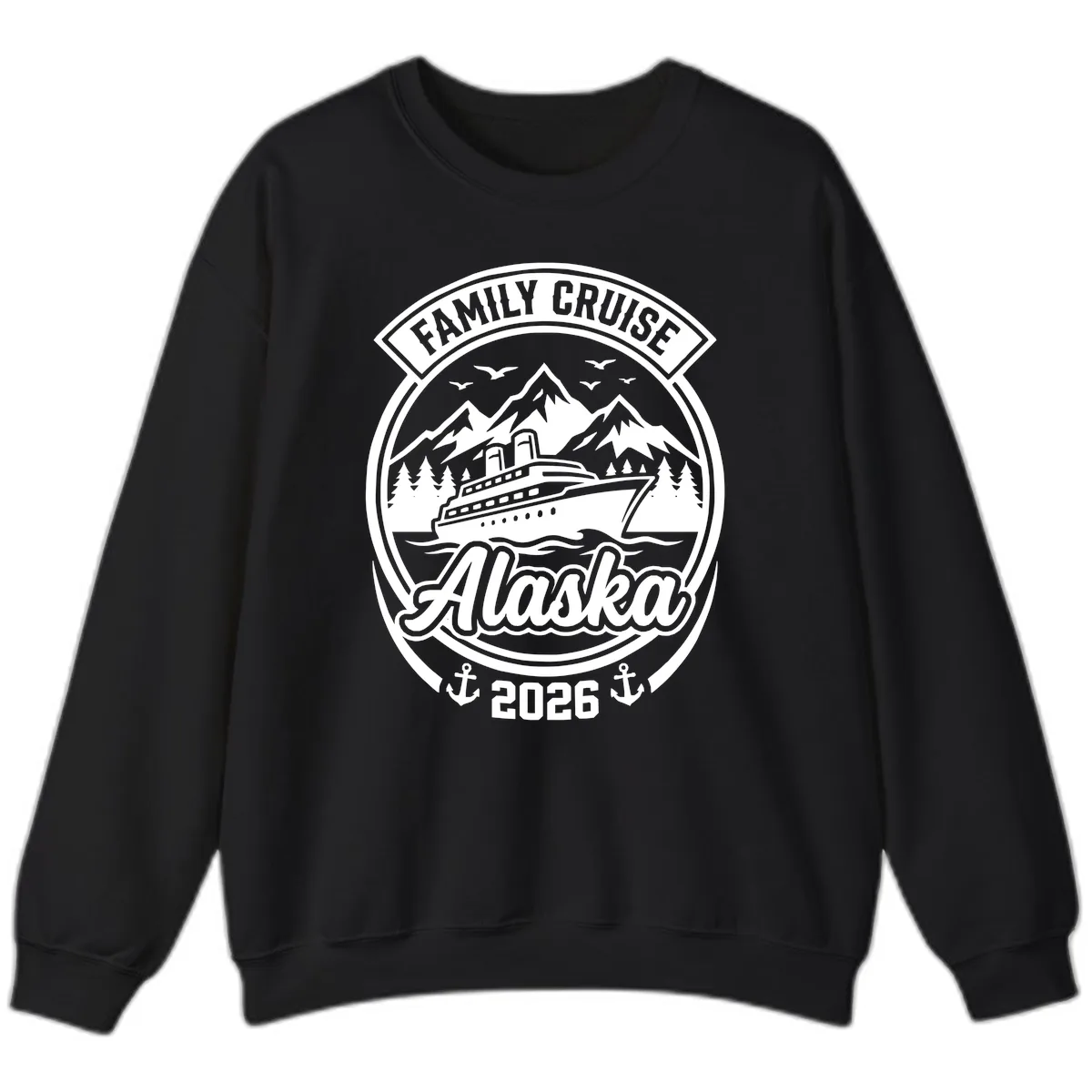 The detailed vintage badge design, with the cruise ship, mountains, and 'FAMILY CRUISE Alaska 2026' text, is printed prominently on the front of the sweatshirt. The design stands out clearly against the sweatshirt fabric.
