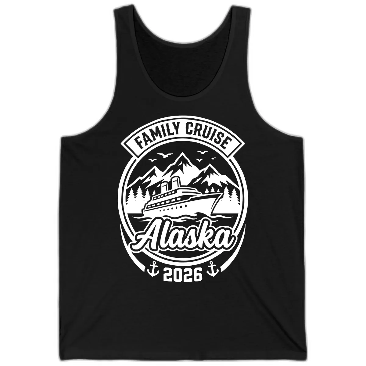 The vintage-style badge design, with the cruise ship, mountains, and 'FAMILY CRUISE Alaska 2026' text, is printed clearly on the front of the tank. It's a great way to showcase your Alaskan adventure in a light, breathable garment.
