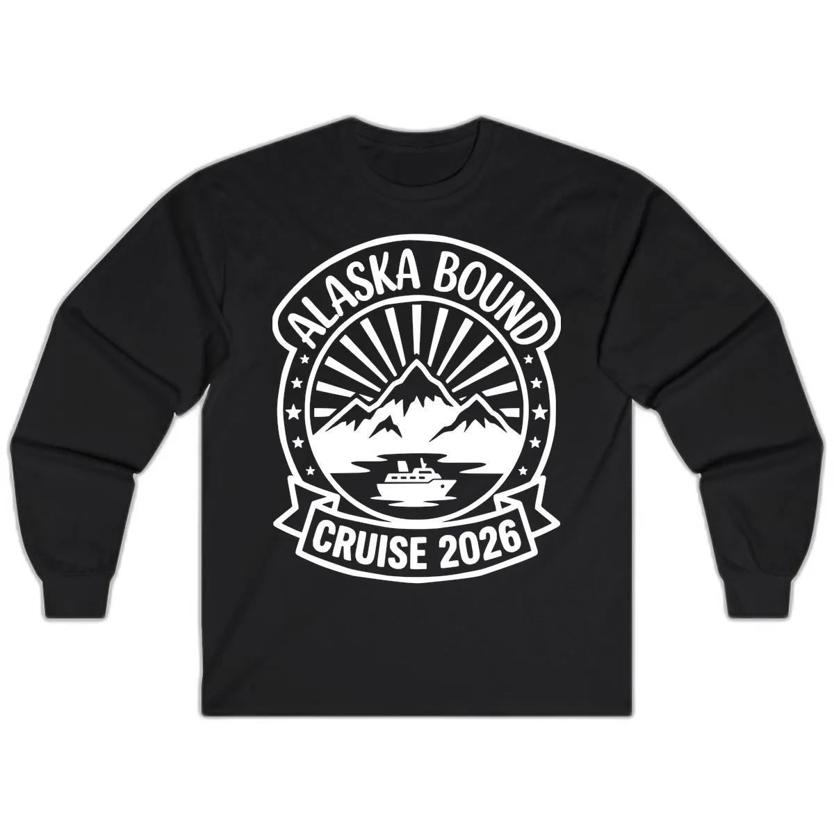 Stay comfortable and stylish on your 2026 Alaska cruise with this long-sleeved tee! It features our signature vintage badge design, showcasing majestic snow-capped mountains, a classic cruise ship, and radiant sun rays. This design is perfect for commemorating your journey and is a fantastic option for cooler days at sea or in port. Get ready to make memories in the Last Frontier!