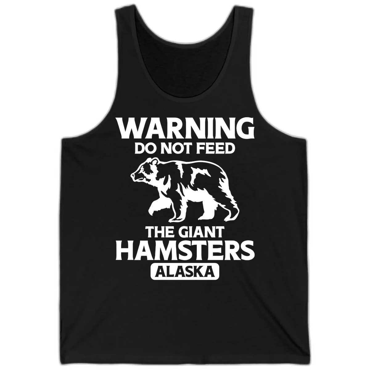 The bold 'DO NOT FEED THE GIANT HAMSTERS ALASKA' warning and bear silhouette are prominently displayed on the front of the tank, making the humorous design highly visible and a great conversation starter.