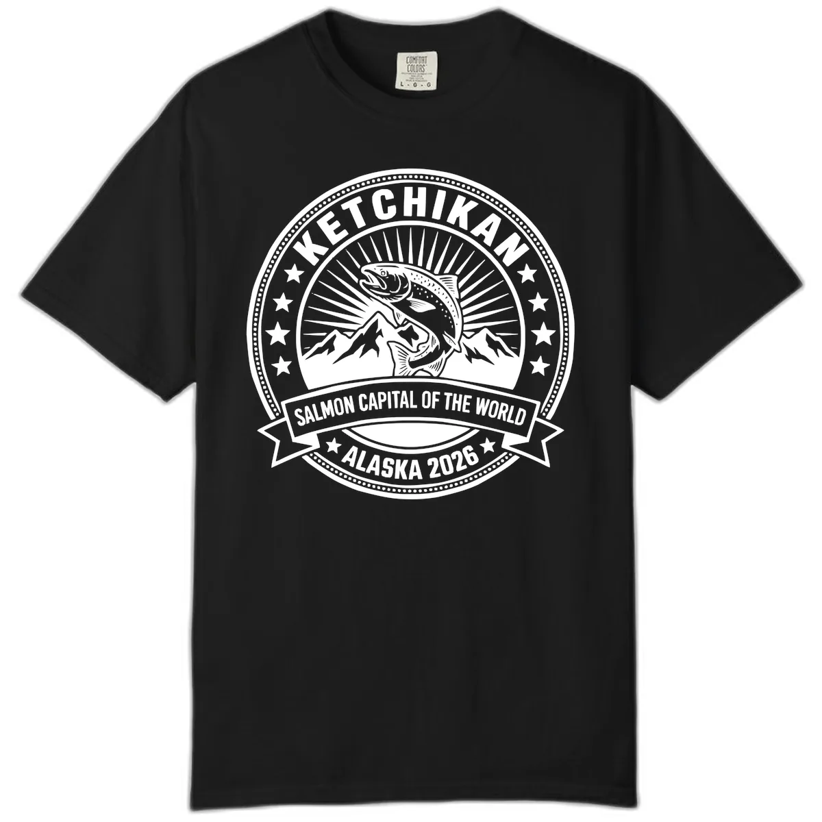 Comfort Colors shirts are renowned for their soft, garment-dyed fabric that gives them a vintage, lived-in feel right from the start. This unique texture perfectly complements the classic badge design celebrating Ketchikan, Alaska's Salmon Capital.