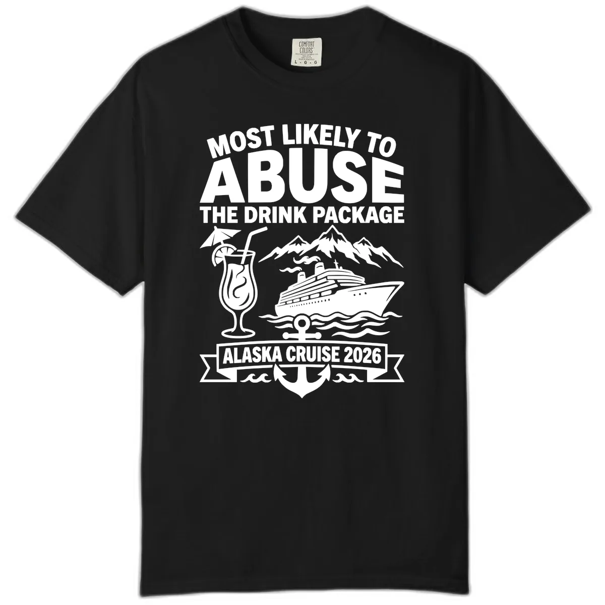 Get ready for the most comfortable cruise of your life with this ultra-soft Comfort Colors tee! Designed for those who plan to fully indulge in their Alaska cruise, the 'Most Likely To Abuse The Drink Package' graphic is a hilarious badge of honor. It’s the perfect blend of laid-back comfort and cruise-ready humor, ensuring you look and feel amazing whether you're on deck or exploring glaciers.