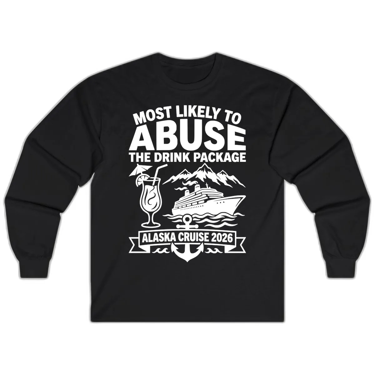 The 'MOST LIKELY TO ABUSE THE DRINK PACKAGE ALASKA CRUISE 2026' design is printed using durable methods to ensure the bold text and graphics, including the nautical elements, remain vibrant even after multiple washes.