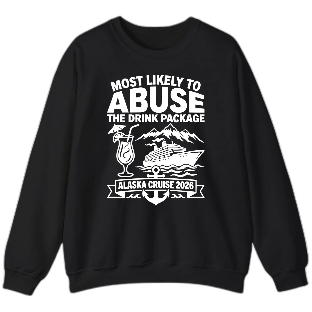 Keep the cruise spirit alive even when the temperature drops with this cozy sweatshirt! Featuring our signature 'Most Likely To Abuse The Drink Package' design, it’s the ultimate way for your group to stay warm and share laughs on your Alaska adventure. Perfect for chilly mornings on deck or relaxing evenings, this sweatshirt combines ultimate comfort with hilarious cruise humor. It’s the perfect souvenir to remember your fun-filled vacation and your crew's legendary status.