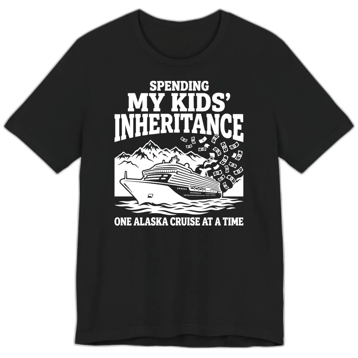 Elevate your Alaska cruise style with this premium tee, designed for those who appreciate both comfort and comedy. This shirt boldly declares your vacation philosophy: "Spending My Kids' Inheritance One Alaska Cruise At A Time." The vibrant, humorous design features a majestic cruise ship navigating snowy Alaskan landscapes, with dollar bills playfully swirling in the air. It’s the ultimate statement piece for the financially flexible cruiser!