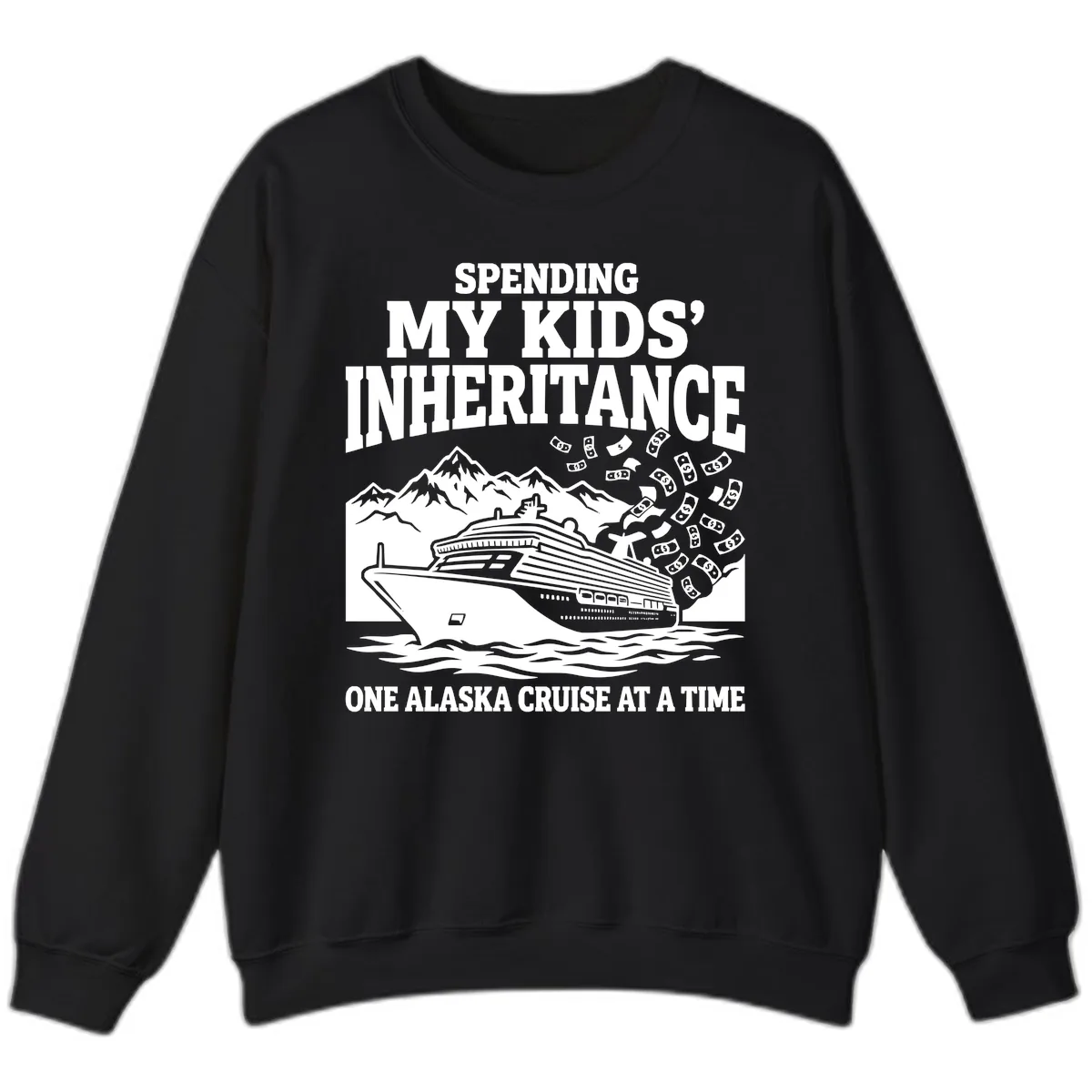 The humorous design, featuring the cruise ship, mountains, and money, is printed with high quality to ensure it stands out vibrantly against the sweatshirt fabric. The bold text 'SPENDING MY KIDS' INHERITANCE ONE ALASKA CRUISE AT A TIME' remains clear and impactful.