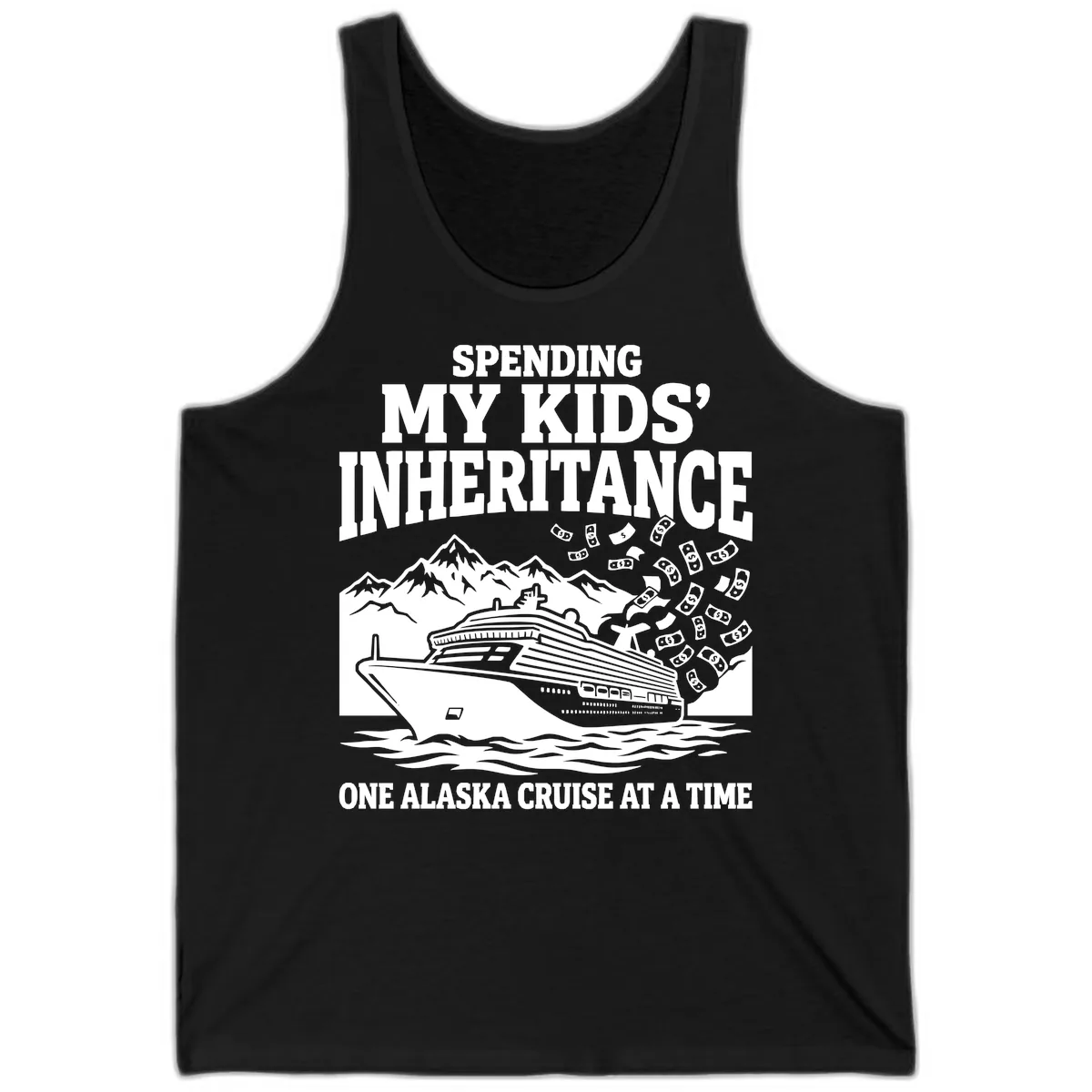 The humorous design is printed clearly and vibrantly on the tank top, making the 'SPENDING MY KIDS' INHERITANCE ONE ALASKA CRUISE AT A TIME' message pop. It's a fun statement piece for your cruise wardrobe.