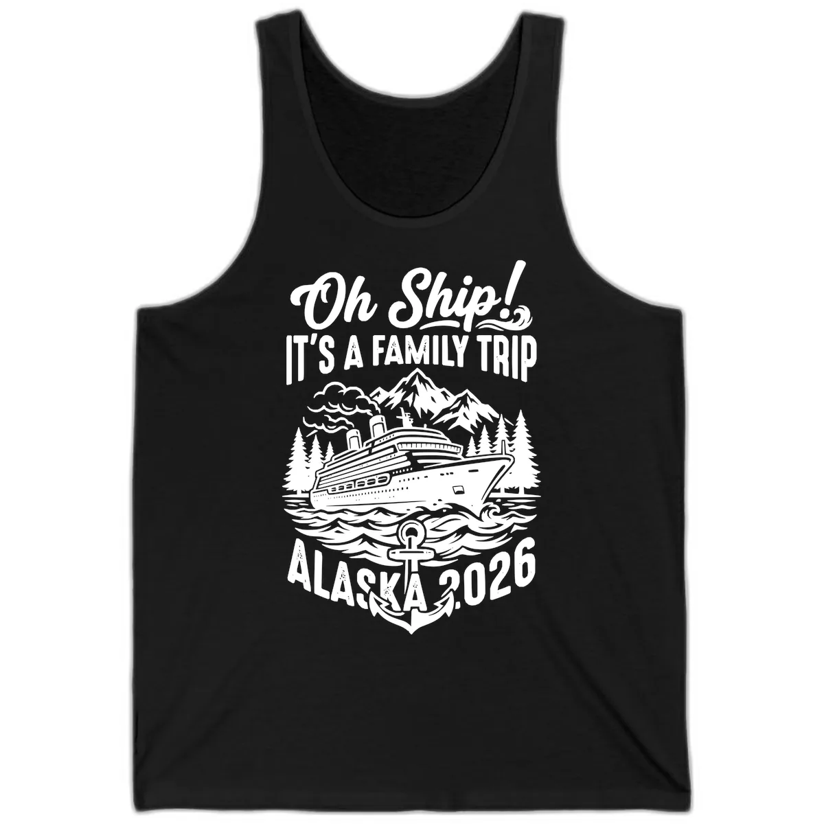 The fun 'Oh Ship! IT'S A FAMILY TRIP ALASKA 2026' design, featuring the cruise ship and Alaskan scenery, is printed clearly on the tank. It's a great way to show off your cruise spirit in warmer weather.