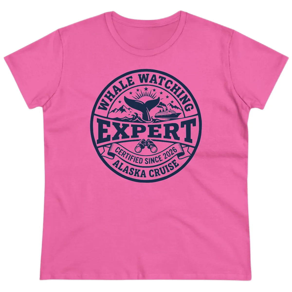 Ladies, get ready to flaunt your marine mammal mastery with this "Whale Watching Expert" tee designed just for you! This shirt is your official stamp of approval for successfully spotting whales on your unforgettable Alaska cruise. The eye-catching circular badge features a stunning whale tail, majestic snow-capped mountains, and a classic cruise ship, all designed to celebrate your incredible wildlife encounters. Look and feel amazing while sharing your Alaska adventure stories!