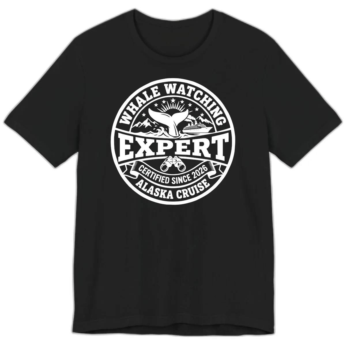 Elevate your Alaska cruise wardrobe with this premium "Whale Watching Expert" tee! This isn't just any shirt; it's a stylish badge of honor for those who've witnessed the awe-inspiring beauty of whales in their natural habitat. The intricate circular design, complete with a striking whale tail, majestic mountains, and a sleek cruise ship, is printed on a super-soft fabric that feels as good as it looks. Get ready to be the envy of the Lido deck!