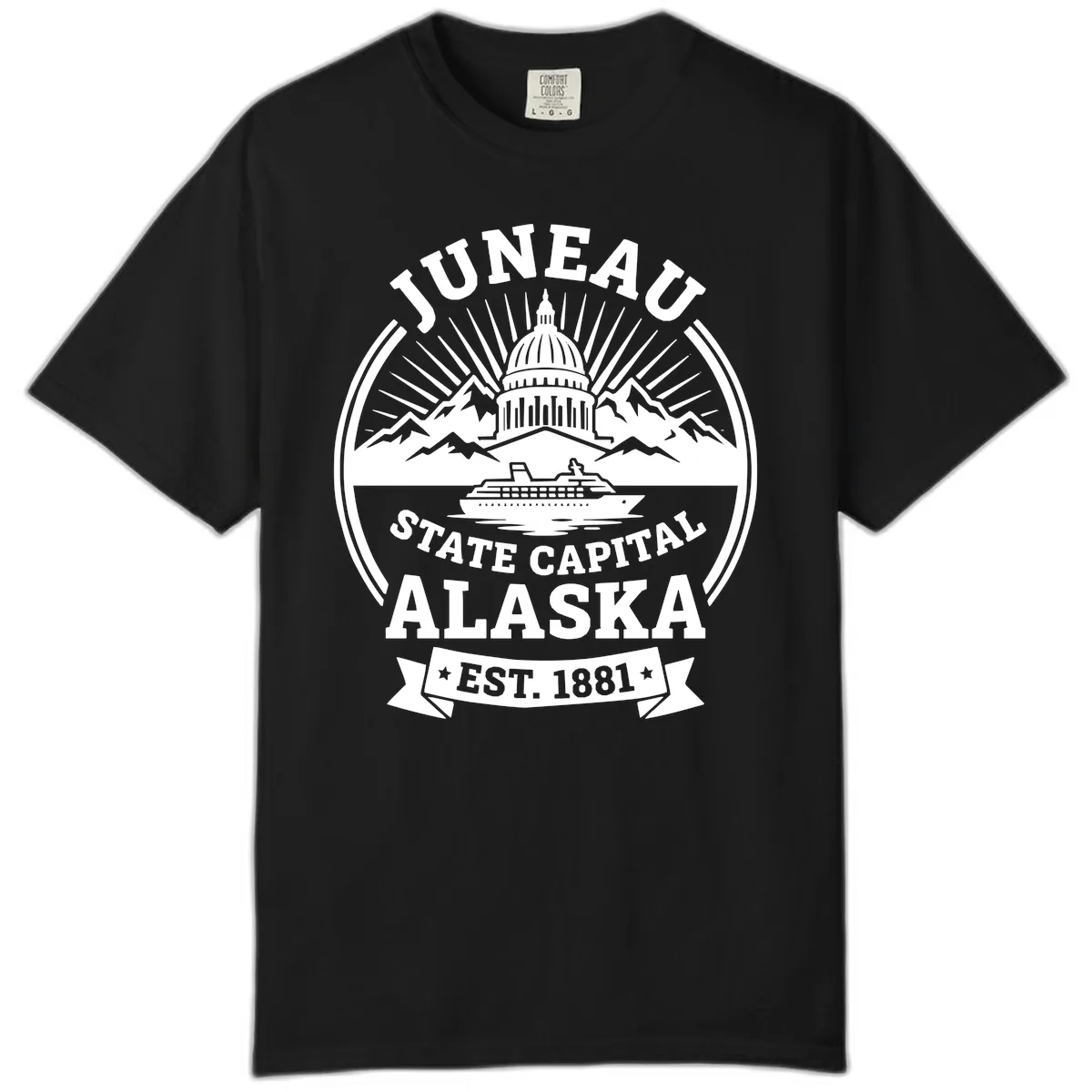 Dive into the heart of Alaska with the Juneau State Capital Alaska Cruise Badge Comfort Color shirt. Designed for those who value both style and supreme comfort, this tee features a distinctive badge graphic celebrating Juneau's unique position as a state capital nestled amongst glaciers. It’s the perfect blend of official charm and relaxed vacation vibes.