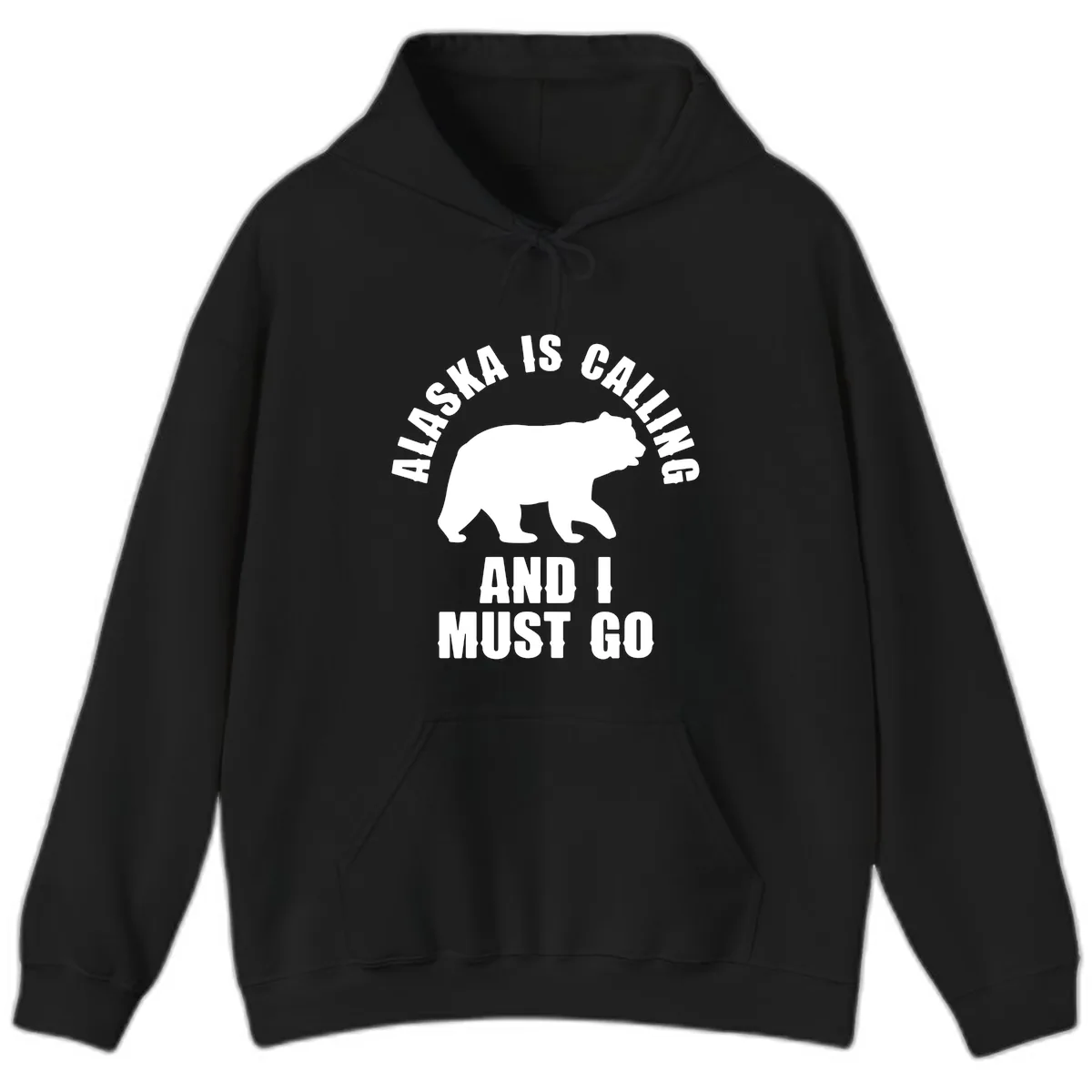 The main 'ALASKA IS CALLING AND I MUST GO' text and bear silhouette graphic are printed prominently on the front of the hoodie. The hood itself offers extra coziness and protection from the elements.