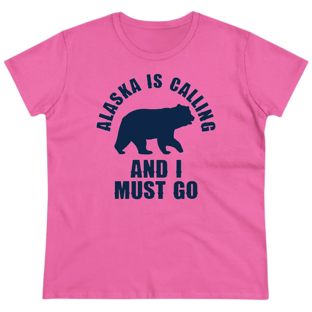 The 'ALASKA IS CALLING AND I MUST GO' text and the bear silhouette are scaled and positioned to look great on the ladies' cut. The design maintains its impact while complementing the feminine shape of the shirt.