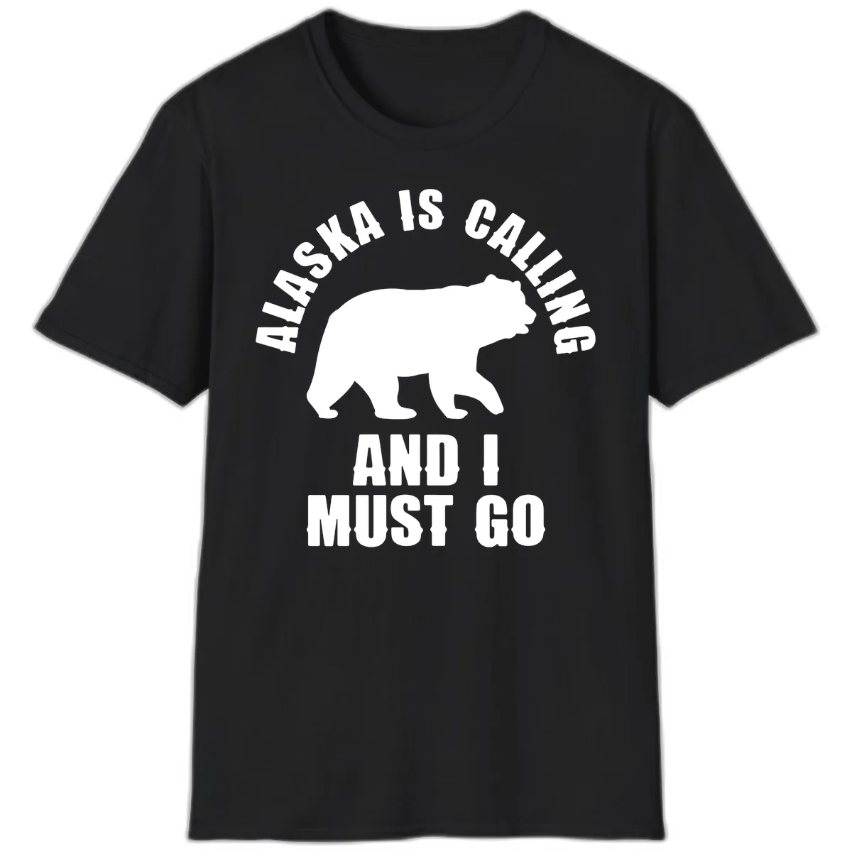 The design features a striking silhouette of a bear, symbolizing the wild spirit of Alaska. It's set against a gray background with the phrase 'ALASKA IS CALLING AND I MUST GO' in a bold, curved text above and below the bear.