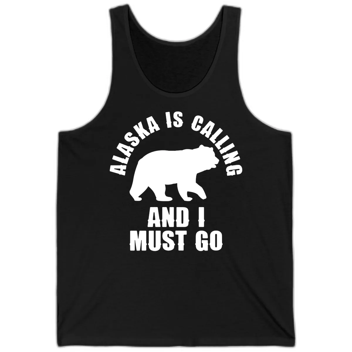 The design, featuring the bear silhouette and the text 'ALASKA IS CALLING AND I MUST GO,' is printed clearly on the front of the tank. It maintains its visual impact, making it a fun statement piece for your vacation.