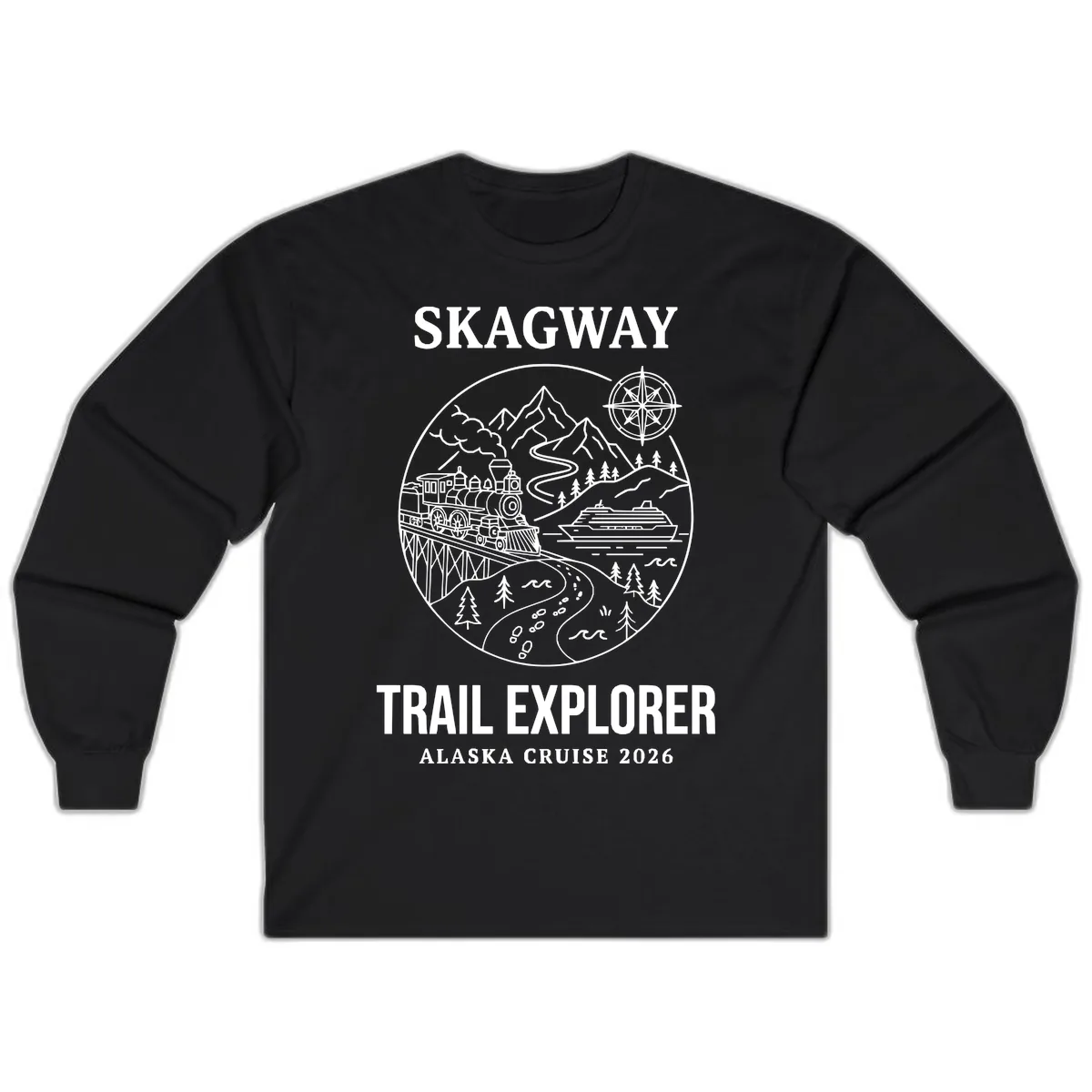 Stay comfortable and stylish on your Alaskan journey with the "Skagway Trail Explorer" Long Sleeve shirt. This tee is designed for those who love to explore, featuring a captivating illustration of Skagway’s iconic steam train, a majestic cruise ship, and the stunning mountain scenery. It’s the perfect way to commemorate your 2026 Alaska cruise and your adventurous spirit.