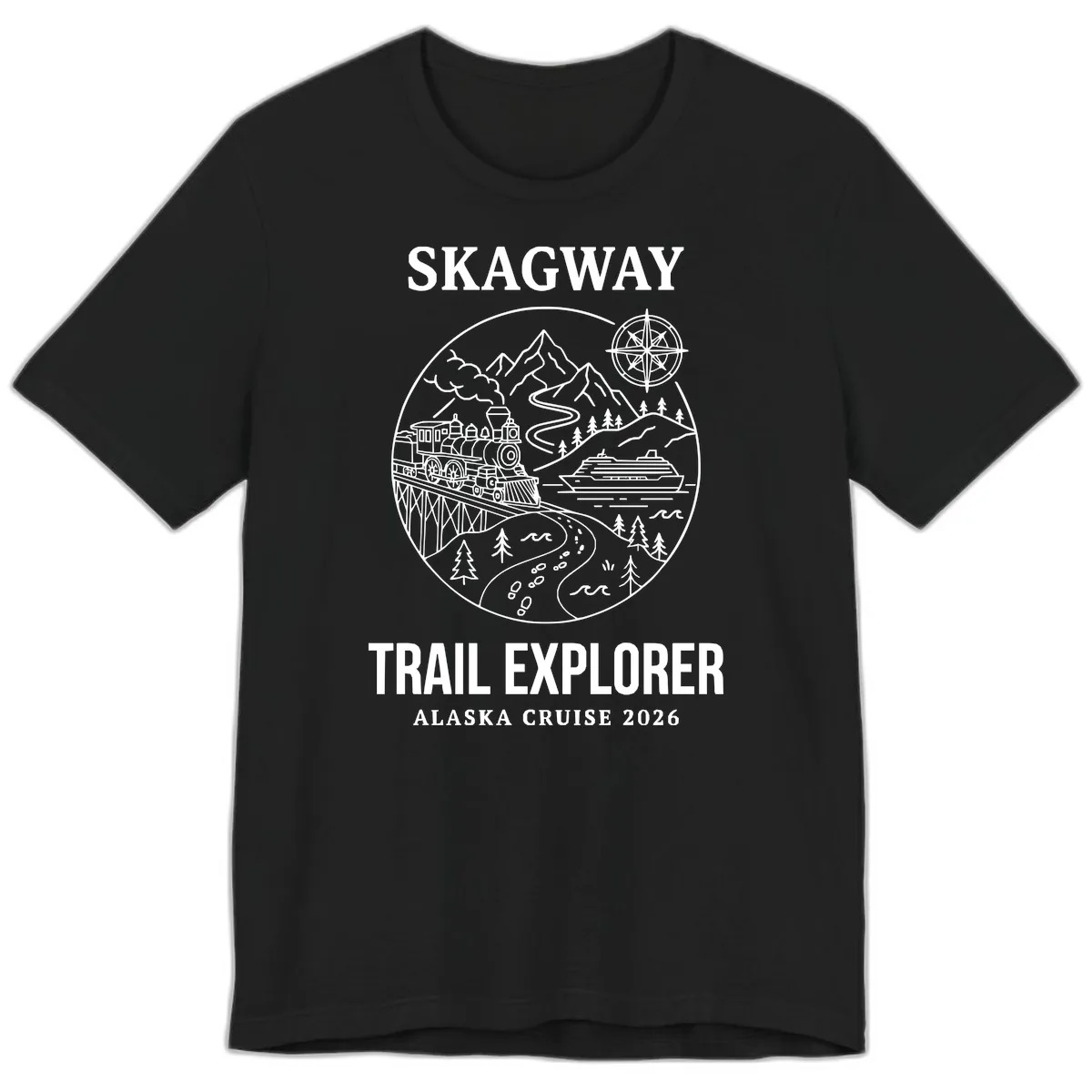 The 'SKAGWAY TRAIL EXPLORER ALASKA CRUISE 2026' text is integral to the circular badge design and remains clear and legible on the premium T-shirt.