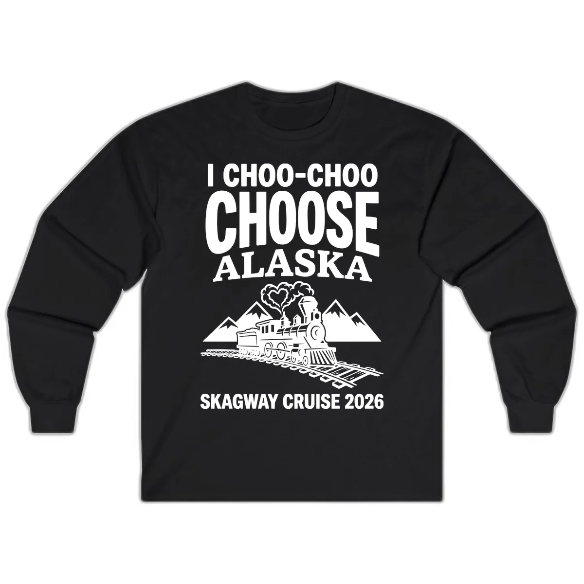 The 'I CHOO-CHOO CHOOSE ALASKA SKAGWAY CRUISE 2026' design is prominently displayed on the front, featuring the steam locomotive and mountain illustration. The long sleeves offer a classic canvas for this fun graphic.