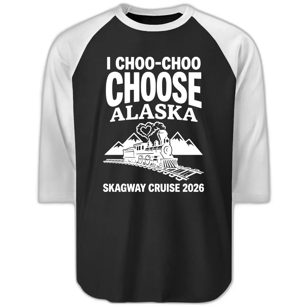 Hit the rails in style with our 'I Choo-Choo Choose Alaska Skagway Cruise' Raglan 3/4 Sleeve Shirt! This eye-catching design showcases a charming vintage steam locomotive embarking on its journey through stunning Alaskan scenery, crowned by a playful heart-shaped steam cloud. It's the ultimate way to celebrate your 2026 Skagway excursion on the famous White Pass & Yukon Route, blending nostalgic charm with cruise fun.