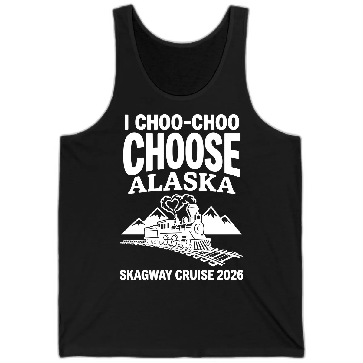 Ride the rails in breezy style with our 'I Choo-Choo Choose Alaska Skagway Cruise' Tank Top! This fun design features a charming vintage steam locomotive venturing through scenic Alaskan mountains, complete with a delightful heart-shaped steam cloud. It's the perfect, lightweight way to celebrate your 2026 Skagway excursion on the historic White Pass & Yukon Route, keeping you cool while you make unforgettable cruise memories. Get ready for smiles and scenic views!