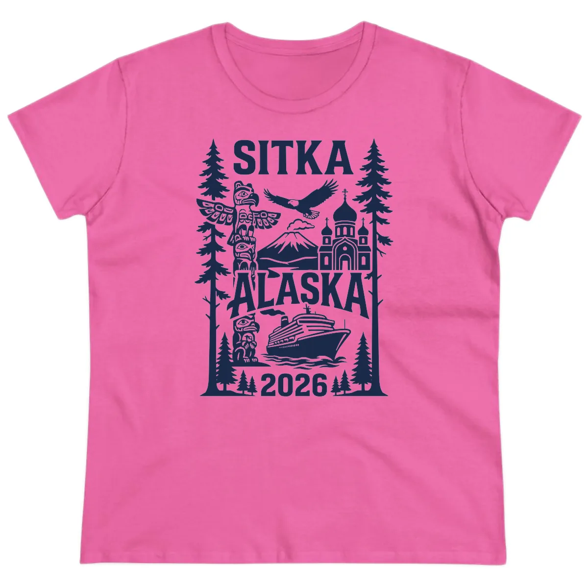 Embrace the spirit of your 2026 Alaska cruise with the enchanting Sitka Alaska Cruise Heritage Ladies Tee! This beautifully designed shirt captures the essence of Sitka, Alaska, showcasing its rich cultural tapestry and breathtaking natural wonders. From the intricate details of totem poles to the serene silhouette of a snow-capped volcano and the iconic Russian Orthodox cathedral, this tee is a wearable piece of art that celebrates your journey.