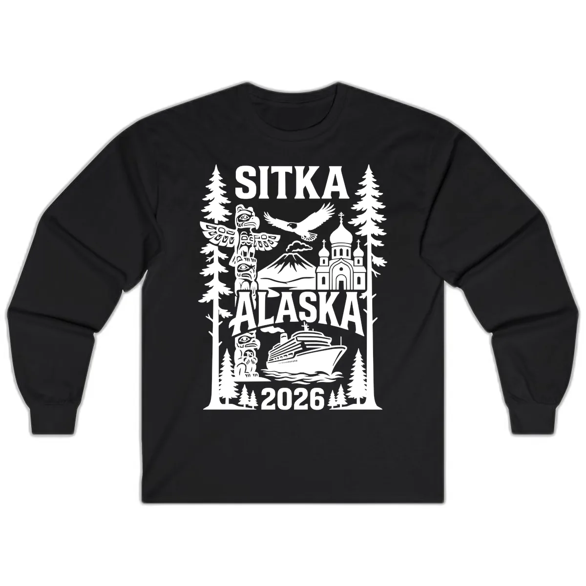 This long sleeve tee features the 'SITKA ALASKA 2026' text along with iconic Sitka landmarks including totem poles, a Russian Orthodox cathedral, a volcano, a cruise ship, evergreen trees, and a bald eagle in flight.